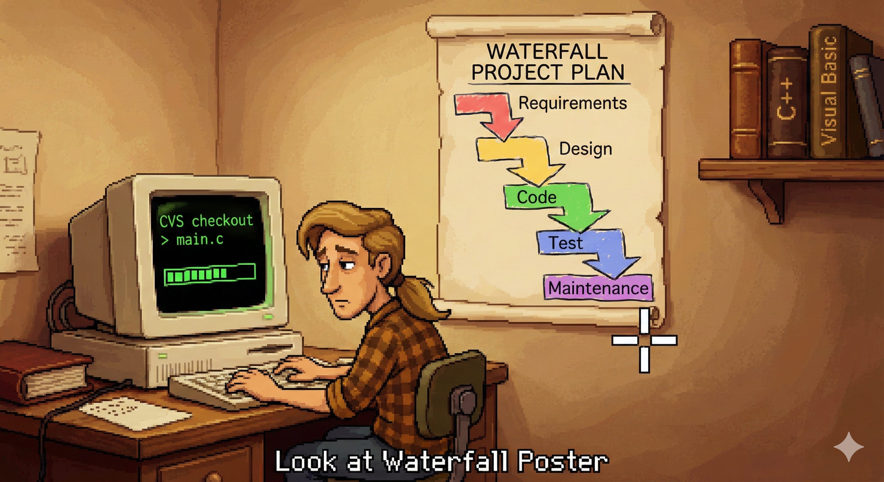Think: physical servers, CVS for version control, month to year long waterfall projects, dedicated ‘testing’ machines.